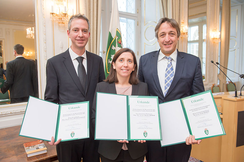 Wichtige Einblicke in die Abläufe des menschlichen Fettabbaus sowie die Entdeckung einer Möglichkeit, einen wichtigen Zellreinigungs-Mechanismus zu steuern: Für diese herausragenden Leistungen wurden zwei WissenschafterInnen der Karl-Franzens-Universität Graz heute, am 11. Dezember 2015, mit Forschungspreisen des Landes Steiermark ausgezeichnet. Univ.-Prof. Dr. Frank Madeo erhielt den mit 12.000 Euro dotierten Erzherzog-Johann-Forschungspreis; Assoz. Prof. Dr. Monika Oberer einen der beiden Förderungspreise für Wissenschaft und Forschung, dotiert mit 6.000 Euro. Der zweite Förderpreis ging an Priv.-Doz. Dr. Peter Ruggenthaler vom Ludwig Boltzmann-Institut für Kriegsfolgen-Forschung. Mit dem Forschungspreis des Landes Steiermark 2015 wurde Univ.-Prof. Dipl.-Phys. Dr. Wolfgang Erhard Ernst von der Technischen Universität Graz gewürdigt. Landesrat Christopher Drexler überreichte die Auszeichnungen im Weißen Saal der Grazer Burg.